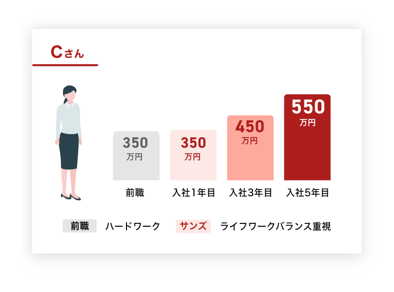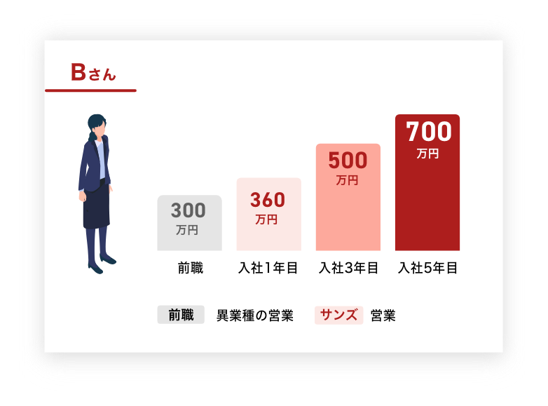 | 給与 | ※過去入社月実績を表記しています (2022年12月支給) 【月給+インセンティブ】 月給:260,000円〜 (固定残業代含む) ※基本給:213,800〜円 固定残業代/月: 46,200円〜/29時間 ※固定残業代は残業がない場合も 支給し、超過する場合は別途支給 半期インセンティブ (詳細は面談でお伝えします) |