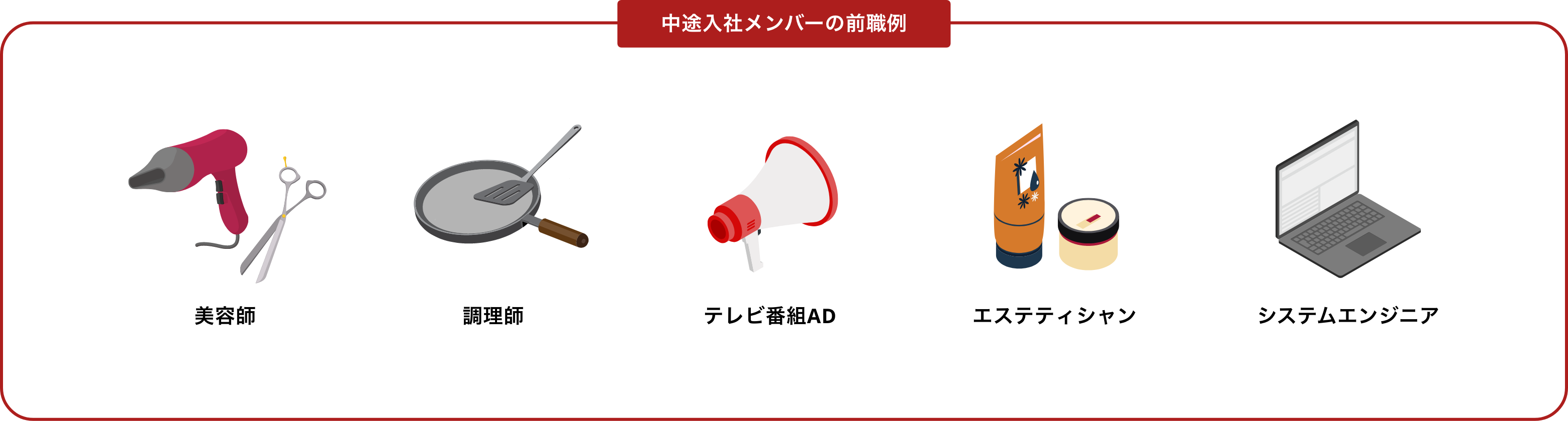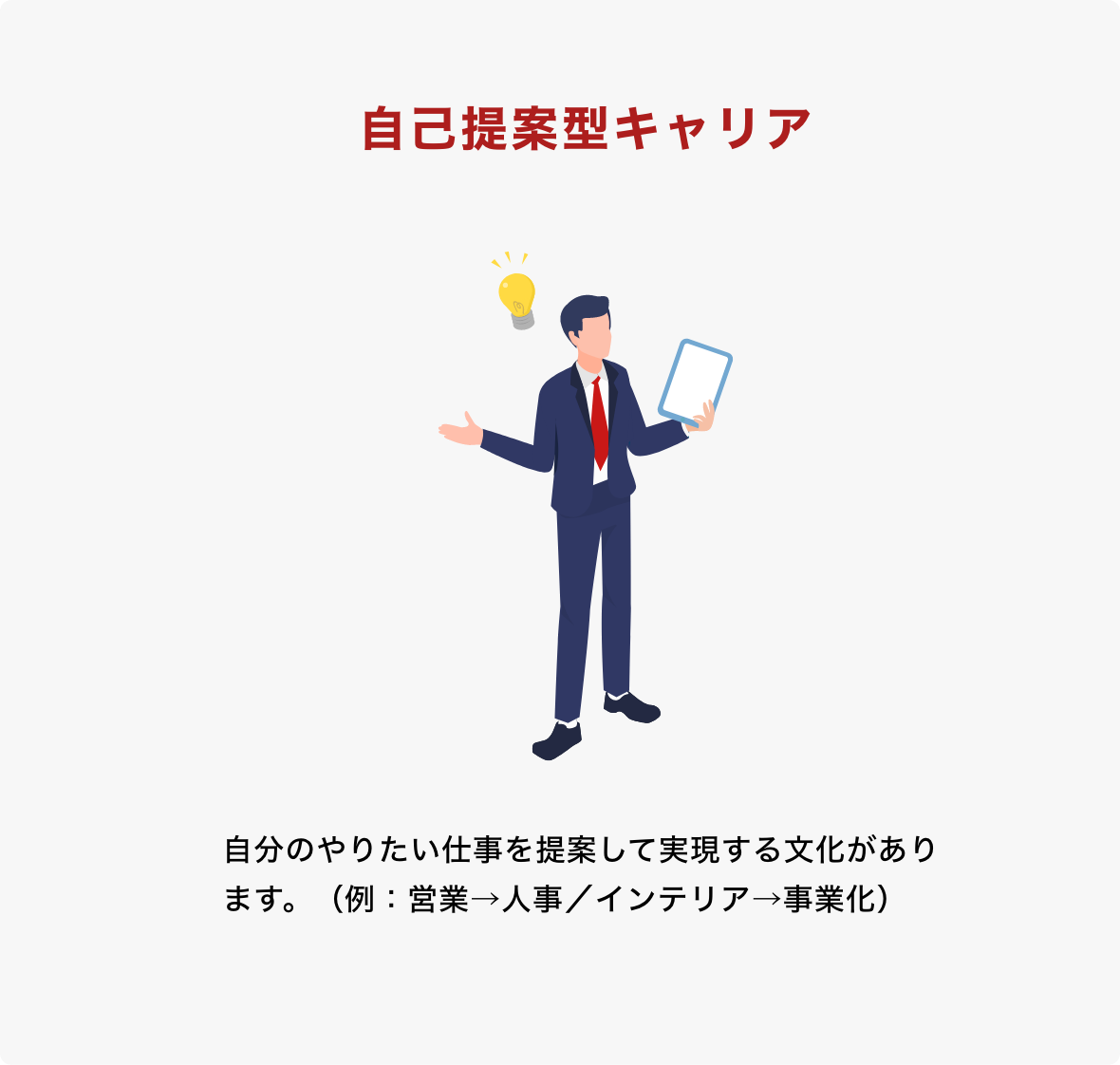 今まで中途入社で入ったメンバーは、他業界出身がほとんどです。不動産・リフォーム業界での経験がなくとも、研修後には一通りの業務をこなせるようになります。むしろ自由度の高いお仕事なので、前職のエッセンスが活きてくるケースも多々あるはずです。